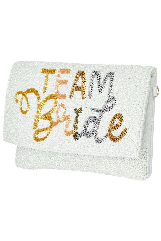 Seed beaded bridal theme, "Team Bride" clutch bag. Includes removable chain.